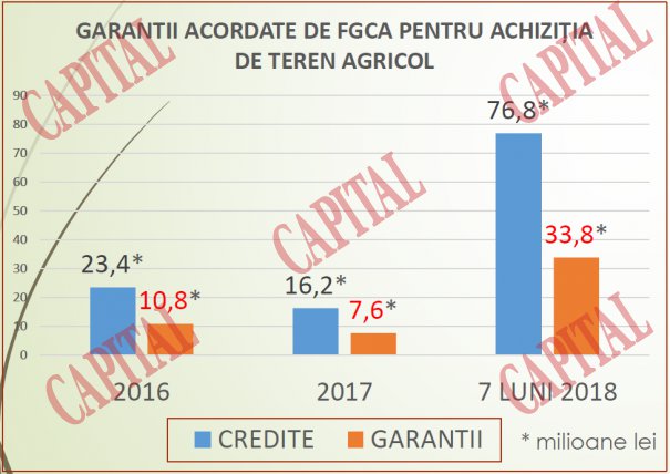 Garanţiile acordate de FGCA pentru achiziţia de teren agricol au totalizat 33,8 mil. lei în primele şapte luni din 2018, faţă de 7,6 mil. lei acordate în tot anul 2017 şi 10,8 mil. lei în tot anul 2016.