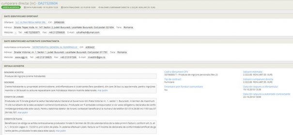 În postarea cu pricina apare şi o fotografie cu un screenshot al facturii care arată clar că Guvernul României cheltuie banii publici pe tot felul de lucruri inutile. De data aceasta, Secretariatul General al Guvernului a achiziţionat creme hidratante în valoare de 2.300 lei.