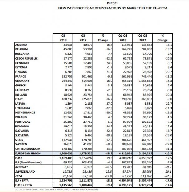Astfel, în primele nouă luni din 2018 au fost înmatriculate în România 45.212 maşini diesel, cu 12,6% mai multe decât în aceeaţi perioadă din 2016. Aceasta este cea mai mare creştere din Europa! Din totalul statelor EU şi EFTA, unde înmatriculările de astfel de maşini scad, în medie, cu 17%, doar în Estonia (+3,4%) şi Cehia (+5,6%) se mai remască majorări ale vânzărilor de vehicule alimentate cu motorină.