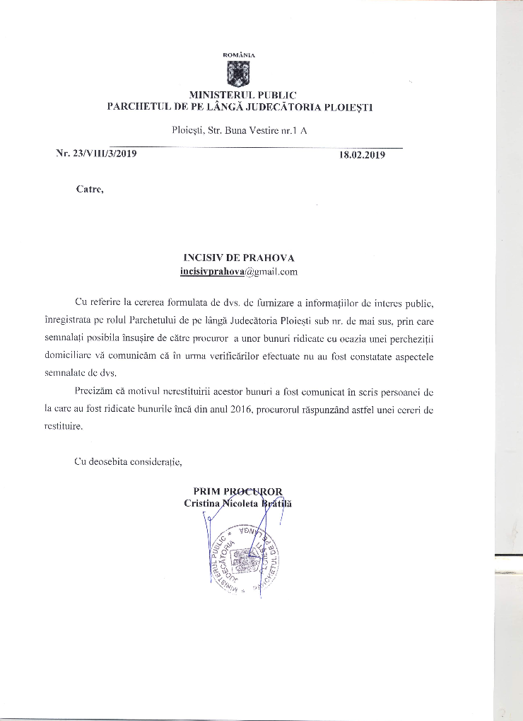 Astfel, ziarul Incisiv de Prahova a inaintat o adresa (nr 0182 din11 februarie 2019) prin care a solicitat Parchetului de pe langa Judecatoria Ploiesti date cu privire la bunurile ridicate de procurorul Topală Teodor-Bogdan, la data de 20.06.2016, in dosarul nr 1539/P/2016 .