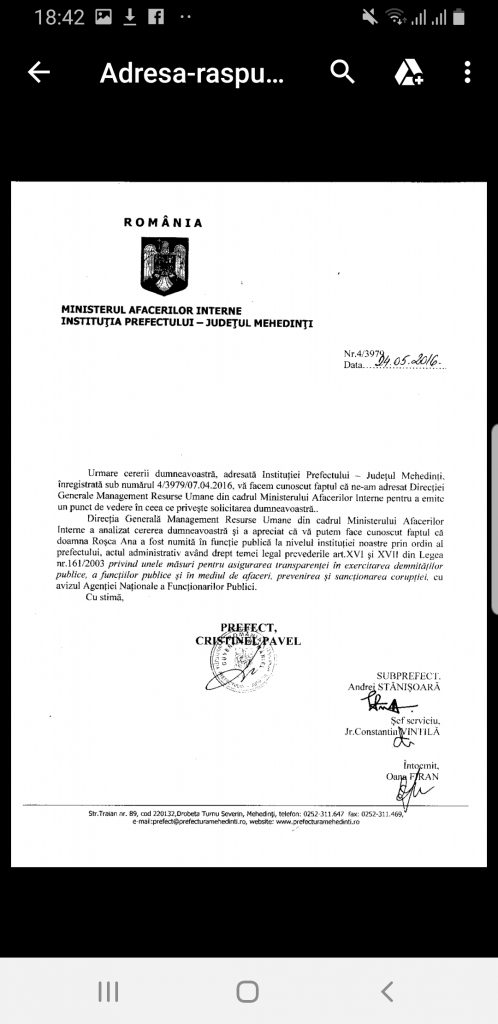 ,,Pe 23 martie,  ziariști au adresat prin e-mail Instituţiei Prefectului Judeţului Mehedinţi o solicitare în baza Legii nr. 544/2001, întrebând când a avut loc concursul prin care Anei Roşca i-a fost schimbată încadrarea din personal contractual în funcţionar public al Prefecturii.