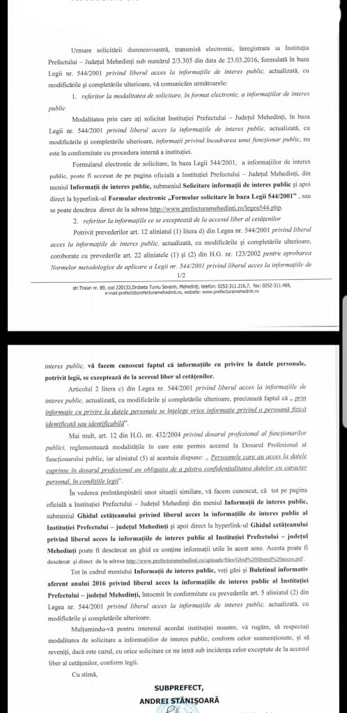 Pe 25 martie, a fost emis un răspuns al Prefecturii Mehedinţi, care a ajuns la redacției  pe 7 aprilie, dintr-o eroare tehnică a Ministerului Afacerilor Interne (instituţie prin care Prefectura ne-a trimis răspunsul).  Prefectului  înştiinţa nici mai mult, nici mai puţin decât că nu se respectă protocolul şi nu se folosește formularul on-line disponibil pe site-ul instituţiei. Ba mai mult: autorităţile dădeau de înţeles că subiectul solicitării ziariștilor intra în categoria datelor personale, care „se exceptează de la accesul liber al cetăţenilor”. Ca şi cum nu ar fi fost de ajuns, aceeaşi instituţie menţiona că „persoanele care au acces la datele cuprinse în dosarul profesional au obligaţia de a păstra confidenţialitatea datelor cu caracter personal, în condiţiile legii”.
