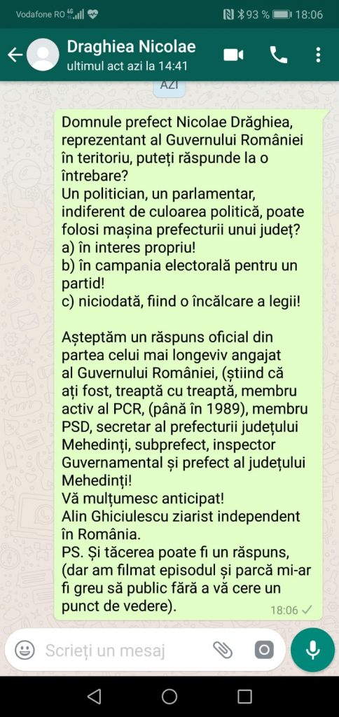 ,,Practic atunci când vreau să scriu ceva de Drăghia și clanul său,  orice lider politic mi-ar oferi orice numai să nu o fac,  și să afle prefectului cine a intervenit să nu continuui anchetele…Să primească,, îngăduință,, la rezultatul final al votului!”, precizeaza jurnalistul Alin Ghiciulescu.
