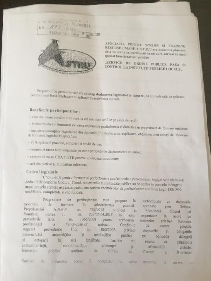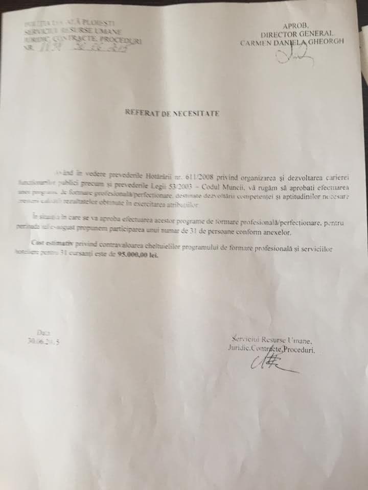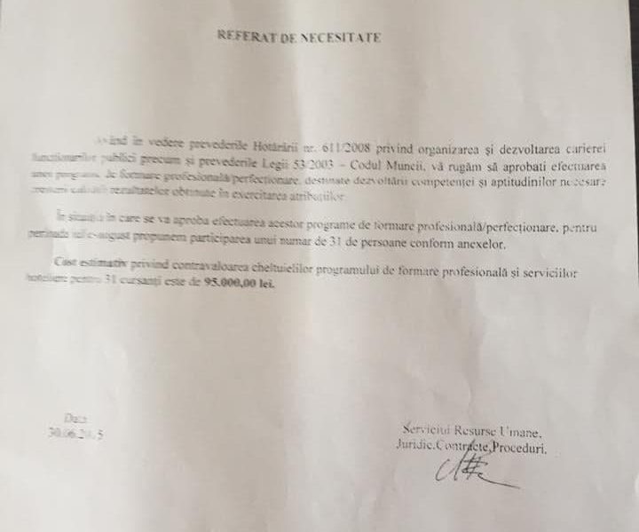 Reamintim ca, prin REFERATUL DE NECESITATE nr. 1098 / 30.06.2015, semnat indescifrabil pentru sef Serviciu resurse umane, juridic, contracte, procedure, s-a solicitat si obtinut aprobarea pentru efectuarea de catre 31 cursanti, in perioada iulie – august 2015 (cu mentiunea „conform anexelor”) a “unor programe de formare profesionala/perfectionare, destinate dezvoltarii competentei si aptitudinilor necesare cresterii calitatii rezultatelor obtinute in exercitarea atributiilor”.