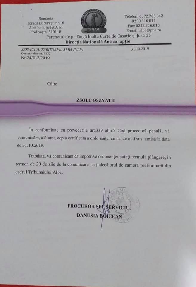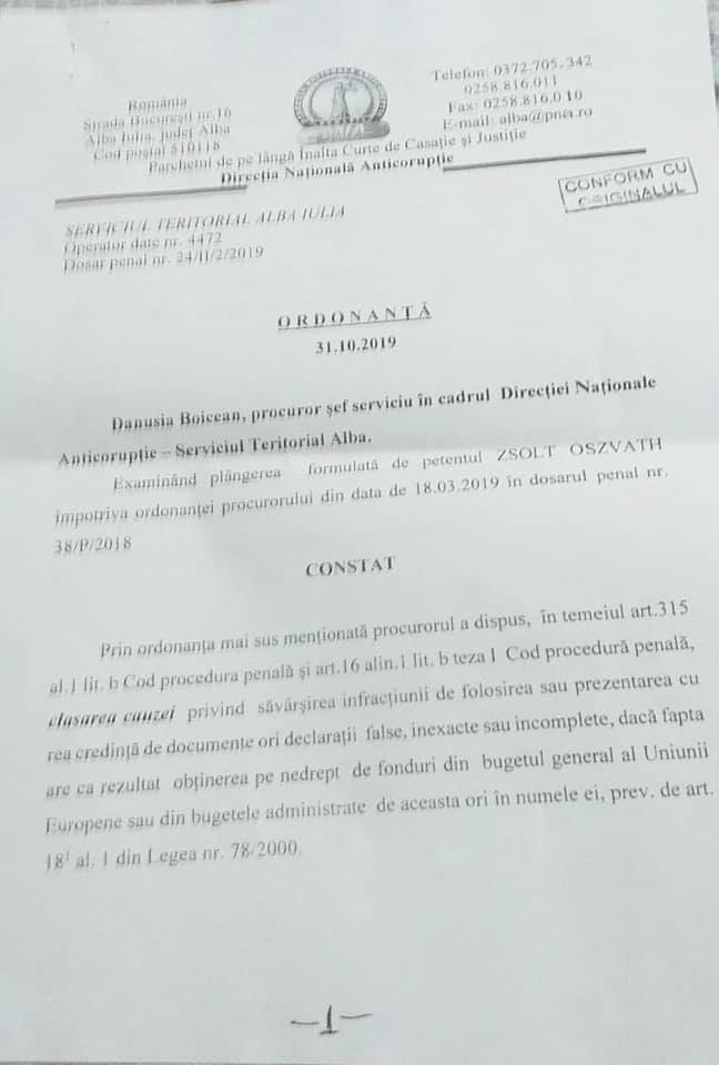 Şefa DNA Alba, prietena LCK de la DIICOT Sibiu, cu rezultate catastrofale la DNA Alba, Danusia Boicean, a comunicat astăzi denunţătorului Zsolt Oszvath în dosarele proiectelor lui Barna, copia ultimei ordonanţe de clasare a DNA Alba (pe care DNA nu a dorit să o transmită), prin care Danusia Boicean şi procurorul de caz, Mihaela Beschiu (cea cu familia în afaceri, nepoata lui Nariţa, șeful PCA Alba/Augustin Lazăr) au închis dosarul pe 18 Martie 2019.