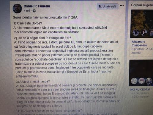 Adevărata şi reala problemă este următoarea: în democraţie orice inginerie socială trebuie să fie rezultatul politic al procesului democratic, adică al alegerilor libere. Când un om, cu propria lui agendă, injectează sume de bani uriașe, comparabile cu sumele de bani injectate de guvernele legitim alese prin procese democratice, inevitabil influenţează, de unul singur, direcţia în care o ia societatea. Un astfel de exemplu este Voiculescu cu Antena 3, care au făcut exact asta. Aşadar, după ce a făcut foarte mult bine oamenilor şi societăţilor din Europa de Est după 1989, Soros se izbeşte acum de puterea politică legitim aleasă a acestor ţări, care consideră că Soros este pe cale să intervină prea mult în societate. Și eu cred că dictatura comunistă nu trebuie înlocuită cu dictatura bunelor intenții oengiste, oricât de generoase pot să pară aceastea. Să nu uităm că drumul spre iad este pavat cu bune intenții. Nu uitați: nu degeaba societățile noastre au evoluat atât de bine bazându-se pe Constituție, și, izvorând din aceasta, pe puterea politică democratic aleasă. Militez ca fiecare să fie cu rolul său: statul și puterea politică democratic aleasă să decidă conținutul și orientarea evoluției societății. Noi, cei care nu sutem putere politică, putem milita cât vrem. Dar nu în universități și școli. Vorba aia: