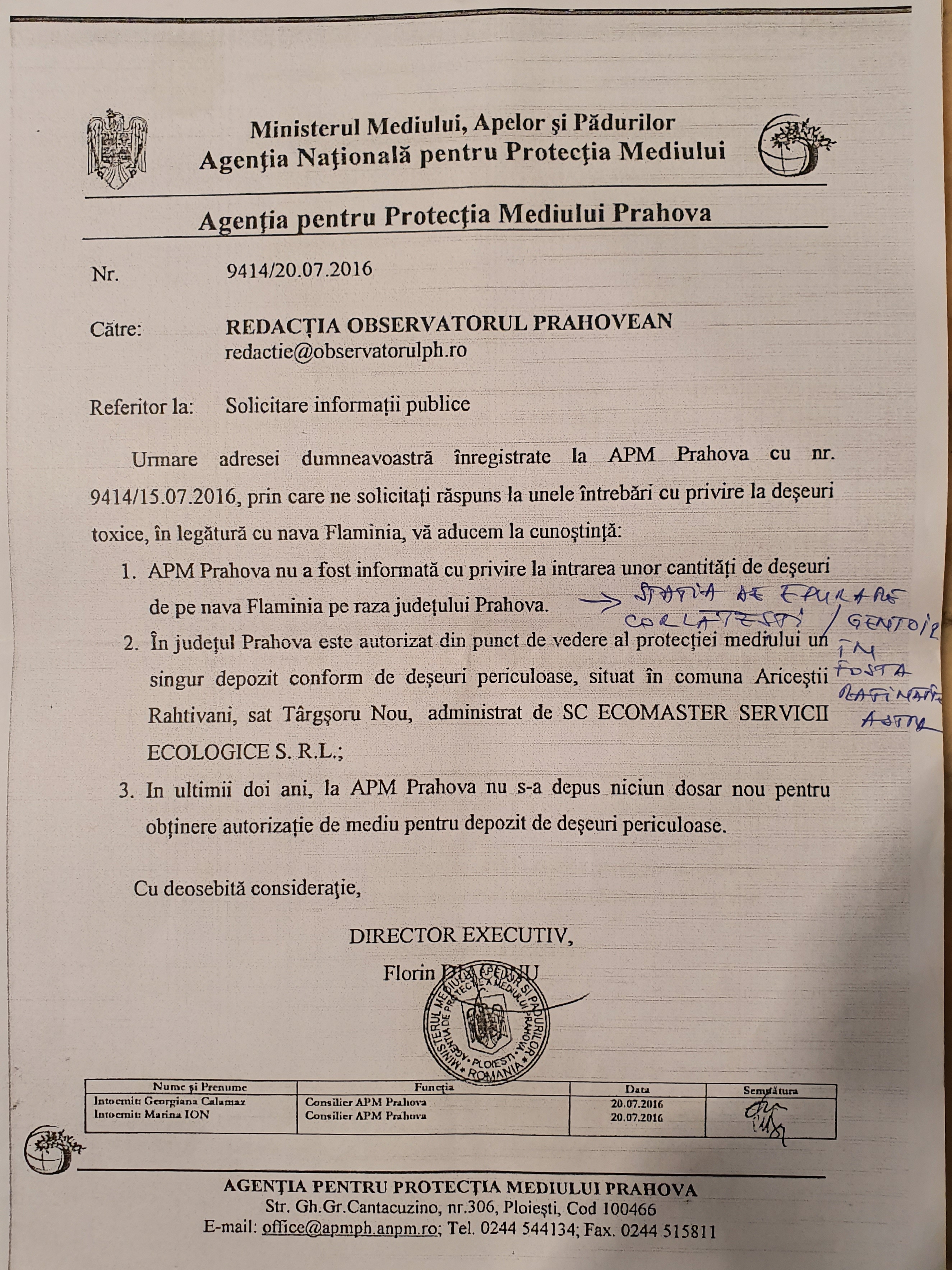 Permiterea, acoperirea protejata si disimulata si incurajarea comiterii de catastrofe de mediu, desi, in ultimii trei ani, la sediul APM Prahova, nu a fost depus, vreun dosar nou, pentru obtinere autorizatie de mediu, pentru depozit deseuri periculoase etc.