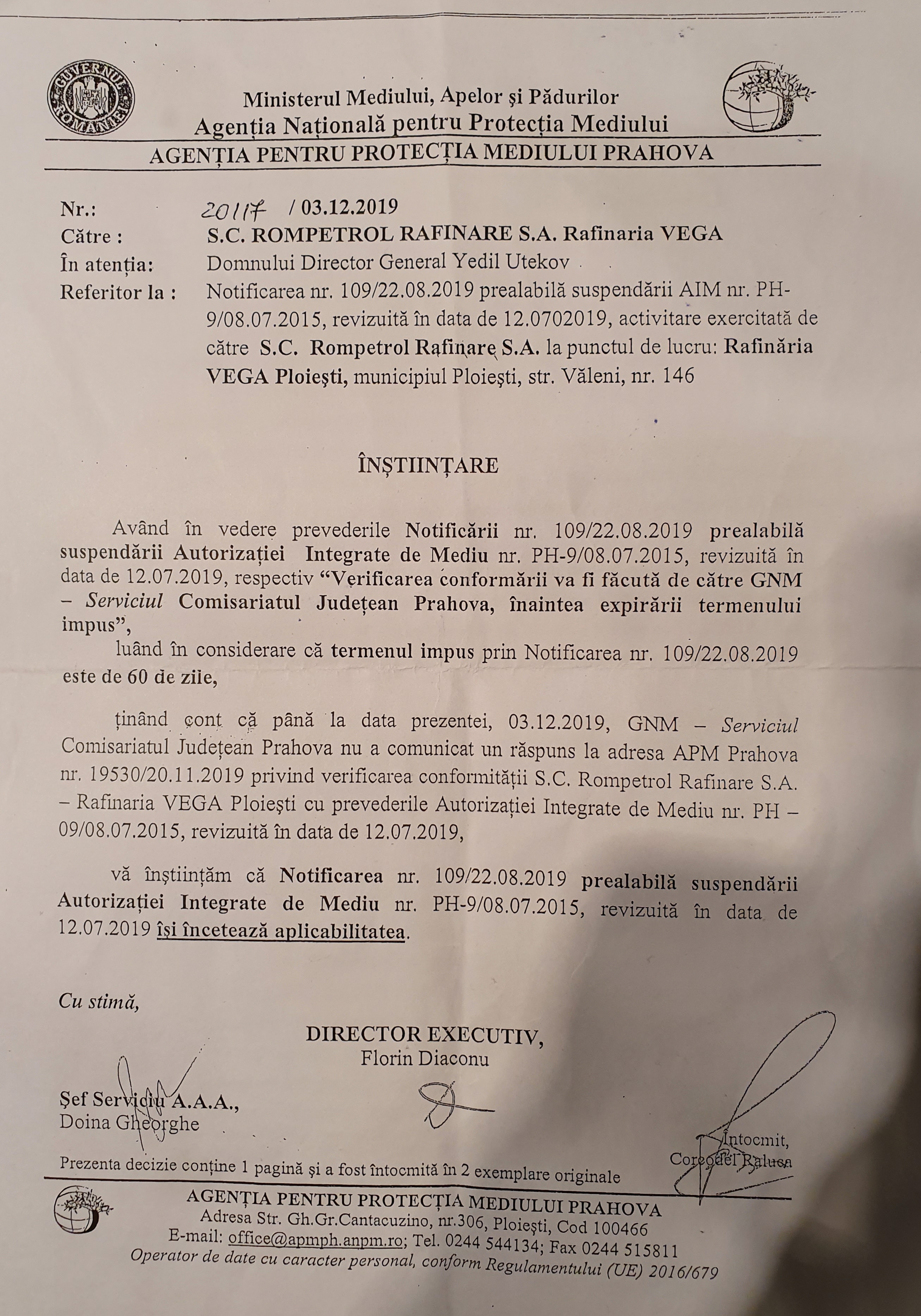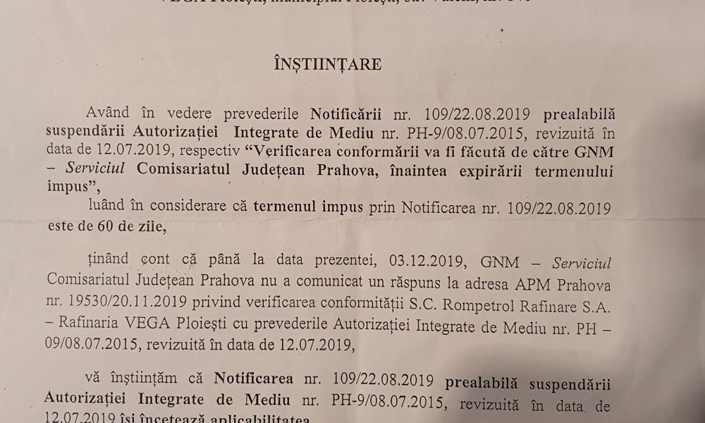 Ticluirea unor corespondente oficiale tip raspunns, la adresa APM Prahova, ca RASPUNS, nr. 19530/20.11. 2019, ref la Compliance-ul Rompetrol Rafinare S.A. VEGA Ploiesti si aplicarea „Suspendarii – Suspendarii”, prin asa-zisa INCETARE A APLICABILITATII.