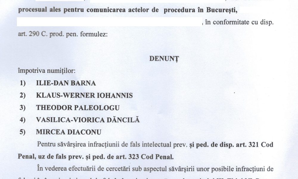 DENUNȚ penal împotriva numiților: ILIE-DAN BARNA, KLAUS-WERNER IOHANNIS, THEODOR PALEOLOGU, VASILICA-VIORICA DĂNCILĂ SI MIRCEA DIACONU