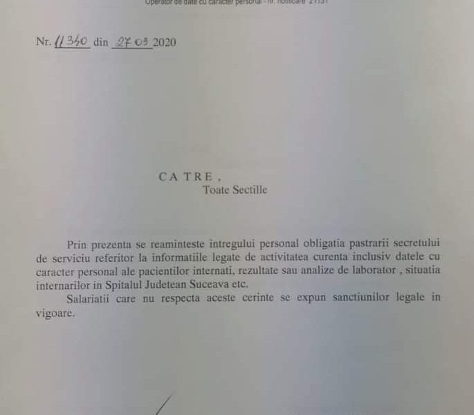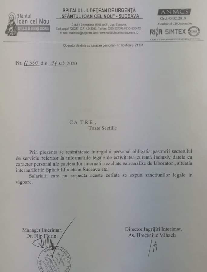 Ei au concluzionat că în contextul pandemiei de coronavirus existente la nivel mondial anumiţi funcţionari publici din sistemul medical au solicitat cadrelor medicale de la Spitalul Judeţean de Urgenţă ”Sfântul Ioan cel Nou” din Suceava prezenţa la data de 23 martie 2020 la serviciu a persoanelor testate pozitiv, negativ şi a celor suspecte, rezultând o posibilă contaminare în masă.