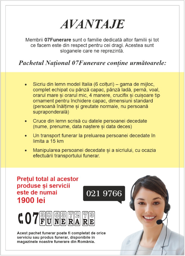 Cand o persoana pleaca dintre noi, nu foarte multe companii de pompe funerare pun accent pe modul in care o astfel de persoana este tratata, asa ca alegerea agentiei funerare conteaza enorm de mult pentru impacarea sufleteasca. Cea mai buna companie de pompe funerare isi manifesta respectul atat fata de cel decedat, cat si empatia fata de organizatori. Si-ti recomandam sa nu faci aceeasi greseala pe care o comit toti, alegand agentia la intamplare. Poti gasi o agentie profesionista care pune atentie la fiecare pas din ritualul unei inmormantari. Un exemplu sunt cei de la 07funerare.ro care iti pun la dispozitie cel mai accesibil pachet funerar si servicii funerare complete premium, pentru un cost mult mai accesibil ca in marea majoritate a companiilor de profil. Poti obtine necesarul de baza si sa gasesti firma potrivita de pompe funerare cu ajutorul intermediarului 07funerare, ce iti pune acum la dispozitie pachete funerare full-option de inmormantare incepand cu 1900 lei, precum pachetul National 07funerare.