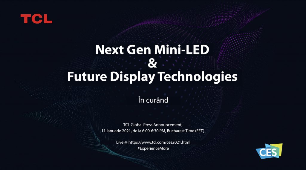 TCL va fi prezent la o multitudine de sesiuni la CES 2021, unde va expune și detalia tehnologii de top pentru ecrane, precum și o gamă largă de electrocasnice pentru uz zilnic, gândite în așa fel încât utilizatorii să #ExperimentezeMaiMult (#ExperienceMore). De notat că pe 11 ianuarie, în premieră, în cadrul secțiunii Global Press Announcement, TCL va prezenta mult așteptatele sale inovații Mini-LED și tehnologiile Future Display, care în mod clar vor capta atenția și interesul mass-media, precum și al consumatorilor industriei de electronice.
