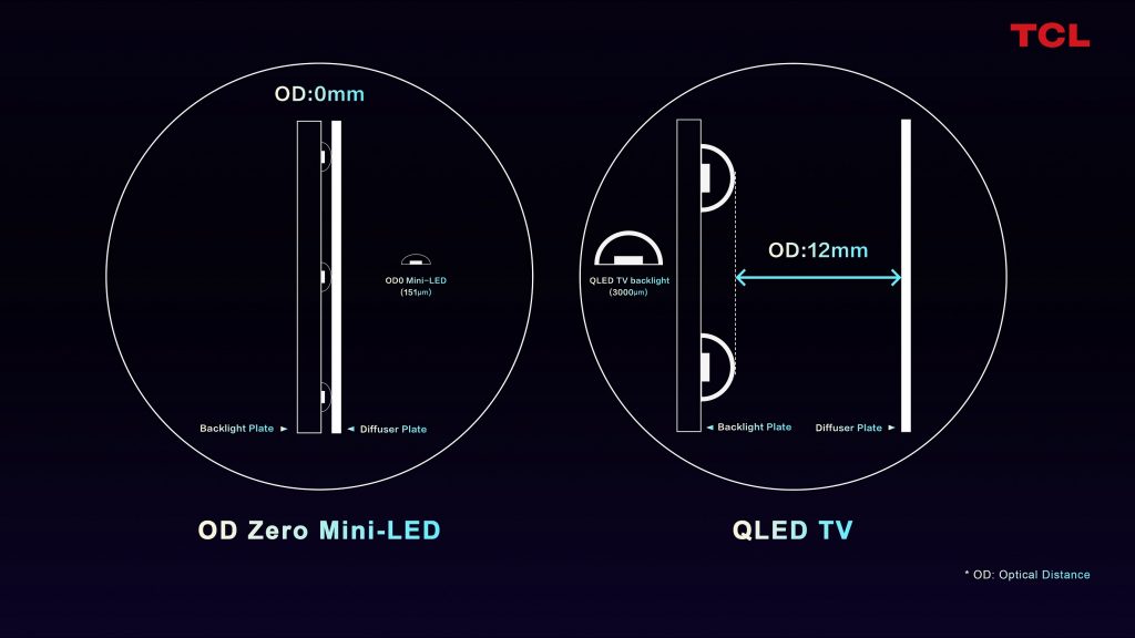 Tehnologia OD Zero combină ultima generație de backlight Mini-LED de la TCL cu un design impresionant realizat printr-o integrare verticală de efect, ultra-slim, ajungând la un produs finit cu un standard care nu a mai fost niciodată realizat la televizoare LED-LCD. În termeni mai simpli, OD Zero reprezintă distanța optică dintre stratul Mini-LED backlight și stratul ecranului LCD (placă-difuzor), care, datorită investițiilor, cercetării și determinării TCL, a fost redus acum la 0 mm, oferind un modul backlight ultra-subțire și de o calitate excepțională. Astfel, prin luminozitatea impresionantă, culorile pline, bogate, extraordinar de bine definite, contrastul precis și uniformitatea excepțională, OD Zero depășește tehnologia anterioară Mini-LED TCL.
