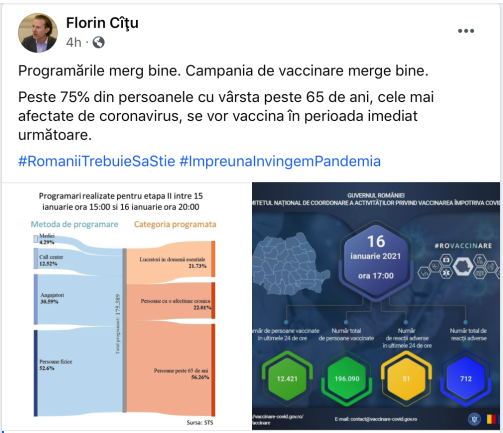 Și de aici, mergem la o altă ,,sursă oficială” – Comitetul Național de Vaccinare. Care, ne informează că până ieri, 16 ianuarie (în jurul orei 14.00 când au emis comunicatul), s-au făcut în Etapa a II-a 305.562 de programări, cu 75% mai mult decât ne informează astăzi, oficial STS, prin primul ministru, pentru un interval care mai include câteva ore.