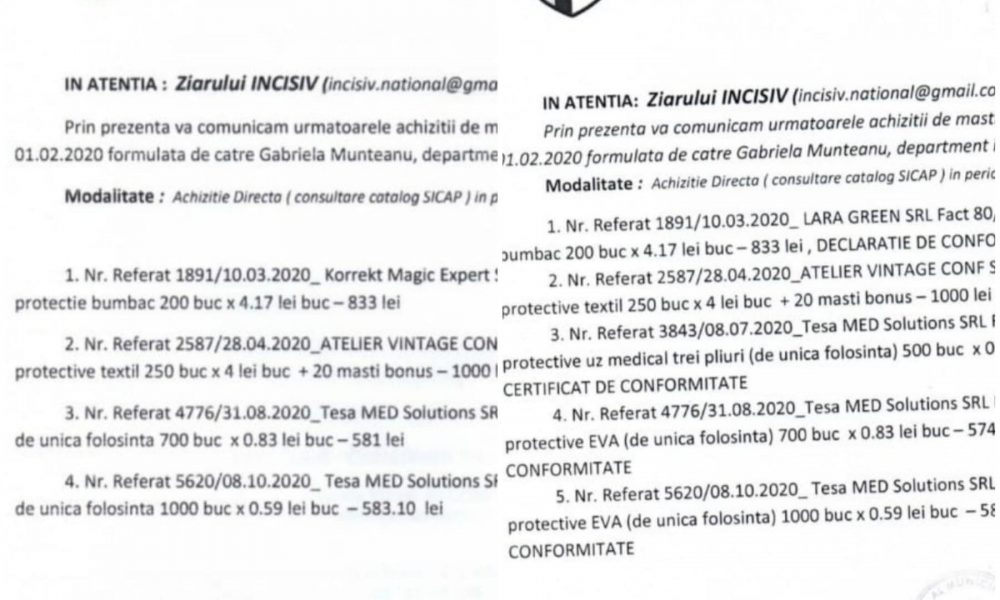 Astfel, in adresa nr 805/17.02.2021, sub semnatura aceluiasi sef de birou Achizitii din cadrul CSM Ploiesti  sunt specificate urmatoarele societati de unde s-au achizitionat masti de catre institutia publica: Lara Green SRL, Atelier Vintage Conf SRL, si Tesa Med Solutions SRL.