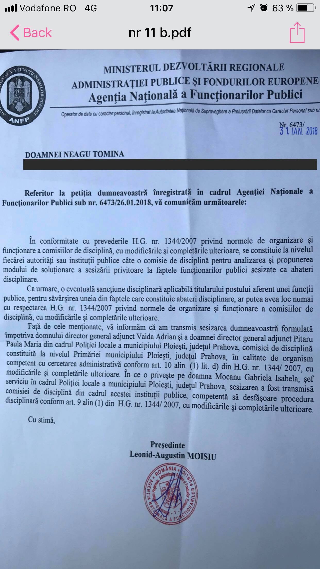 1. La inceputul anului 2018, urmare a sesizarii politistei locale Neagu Tomina dar si a Agentiei Nationale a Functionarilor Publici, Comisia de Disciplina a Primariei avea obligatia legala sa se intruneasca pentru cercetarea administrativa a numitilor Adrian Vaida si Pitariu Paula Maria, conform adresei ANFP dar si adresei primarului Adrian Dobre.