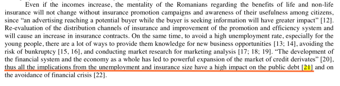 Articolul semnat Marcu nu a suflat nicio vorbă despre șomaj (număr, dinamică or costuri), asigurări sau prime de asigurare, iar articolul care îl citează, al lui Cristea, se numește ,,impactul ratei șomajului asupra dezvoltării (pieței) asigurărilor în România. O abordare statistică.” În fapt, Cristea îi întoarce lui Marcu frauda academică a acestuia din citarea fictivă în primul articol invocat, citându-l la rândul ei, fictiv. Subliniez, în articolul semnat de Marcu și Meghișan nu există nicio referire la șomaj și piața asigurărilor.