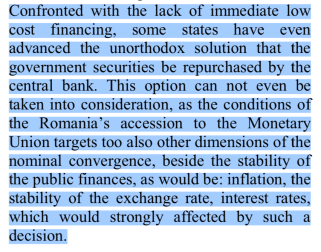 3. Nesurprinzător, cercetătorul post-doctoral Nicu Marcu plătit cu 4.000 de lei pe lună pentru asta (92.000 de lei în total), citează la mișto și chiar împotriva articolul 107 al tratatului. Pentru că articolul 107 vorbește despre independența Bancii Centrale Europene (ECB Nicule). Adică ECB și băncile centrale naționale nu vor căuta și nu vor accepta să primească instrucțiuni de la guverne (etc) și vor fi independente. Cu alte cuvinte, Nicu reinventează articolul 107 al Tratatului, forma originală fiind în mod evident neînțeleasă de Nicu.