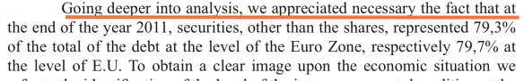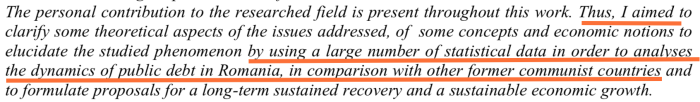 Concluziile (care ar fi trebuit potrivit autorilor să formuleze propuneri pentru o creștere economică sustenabilă) nu există din acest punct de vedere și sunt de-a dreptul, nu mă feresc să o spun, imbecile, măcar și pentru că sunt scrise idiot în limba engleză (foto dreapta): ,,the conditions of the Romania’s accession to the Monetary Union targets too also other….” Ce naiba vrea să spună autorul? Și unde sunt propunerile? Cum s-a împrumutat România? Cum ar fi trebuit să se împrumute România? A făcut sau nu refinanțări ale datoriei publice? Cum sunt scadențele datoriei publice, cum au evoluat, cum au evoluat pe ce tip de scadențe și pe ce monede componentele datoriei publice? NIMIC. Nada. Zero. Niente.
