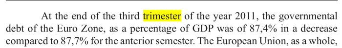 • Trimestru/ ,,Trimester”? În română da, în engleza economică, niciodată. Limba engleză folosită în articol are mai degrabă legătură cu graviditatea și sarcina, folosindu-se spre exemplu termenul ,,trimester” în loc de quarter, pentru indicarea perioadei la care se face referire în rapoartele statistice. La gravide – trimestre. La cercetare economică în limba engleză, quarter, necondiționat.