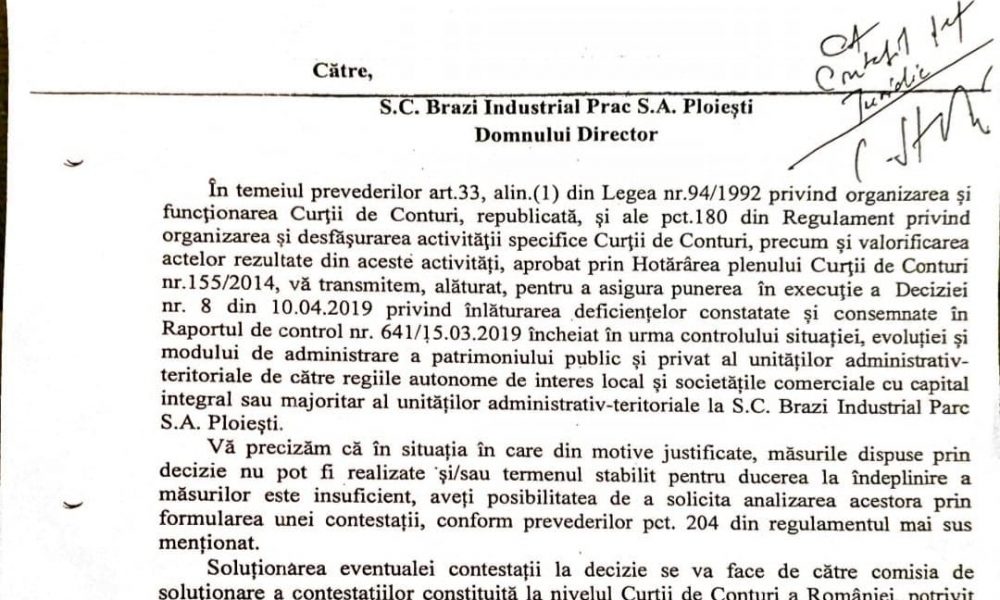 In acest articol va prezentam cum Directorul Parcului Industrial Brazi se considera mai presus de lege prin neaducerea la indeplinire a hotarârii deciziei Curții de Conturi Prahova cu nr 8/10.04.2019