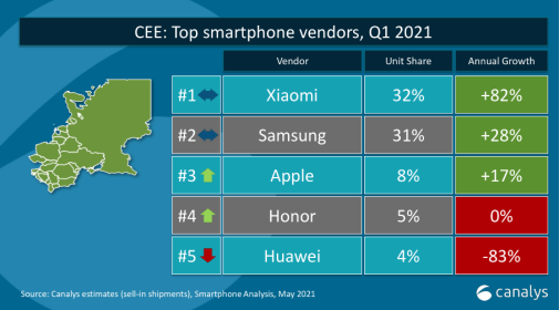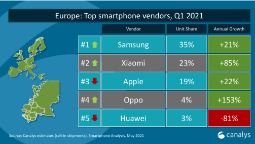 Datele Canalys referitoare la livrările din T1 2021 arată că Xiaomi a fost numărul 2 în Europa pentru prima oară, cu o cotă de piață pe segmentul smartphone de 23% și o creștere de 85% față de aceeași perioadă a anului trecut.