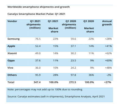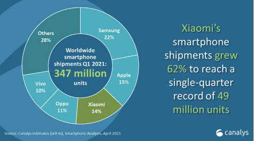 Canalys Smartphone Market Pulse: Q1 2021 a anunțat că Xiaomi a realizat la nivel global cea mai bună performanță trimestrială din istorie, cu o creștere de 62% și livrări de 49.0 milioane de unități. Xiaomi a avut cea mai mare creștere anuală a livrărilor în primul trimestru din 2021 dintre primele cinci branduri de telefoane inteligente.