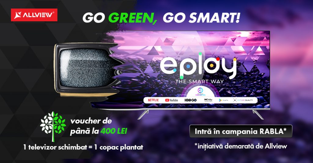 Cea mai nouă campanie de comunicare Allview – desfășurată sub sloganul „Go Green, Go Smart”, aduce utilizatorilor Smart TV-urile gamei ePlay, prevăzute cu sistem de operare Android TVTM, Google Assistant, dar și tehnologii de top integrate, la prețuri competitive, cu discount-uri de până la 400 lei. Pe lângă beneficiul prețului promoțional, clienții ce vor participa la campanie prin achiziționarea unui nou televizor, se vor implica automat în demersurile de protejare a mediului înconjurător întreprinse de compania brașoveană, întrucât Allview plantează câte un copac pentru orice achiziție de Smart TV participant.