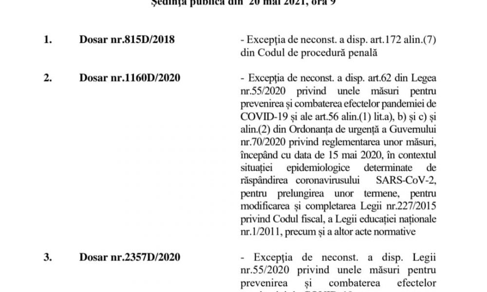 – Excepţia de neconst. a disp. art.62 din Legea nr.55/2020 privind unele măsuri pentru prevenirea și combaterea efectelor pandemiei de COVID-19 și ale art.56 alin.(1) lit.a), b) și c) și alin.(2) din Ordonanța de urgență a Guvernului nr.70/2020 privind reglementarea unor măsuri, începând cu data de 15 mai 2020, în contextul situației epidemiologice determinate de răspândirea coronavirusului SARS-CoV-2, pentru prelungirea unor termene, pentru modificarea și completarea Legii nr.227/2015 privind Codul fiscal, a Legii educației naționale nr.1/2011, precum și a altor acte normative” (Cerasela N.).