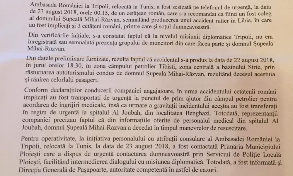 Diferit de lezarea evidenta a onoarei si demnitatii persoanei sotului meu, specialist in sectorul PETROL si de prejudiciul de imagine rasfrant si asupra familiei sale prin aceasta atitudine a Domnului Ambasador, s-a intentionat, concomitent, cu acordul si in autorat cu autoritatea libiana, demantelarea oricarei pretentii a noastre de a elucida aspectele relevate, de a deslusi elementele de analiza si evaluare a evenimentului, de a clarifica cauzele, imprejurarile care au initiat si generat moartea sotului meu, dar si concluziile care se impugn ntr-o asemenea situatie, in care un cetatean roman este declarat decedat, intr-o tara chiar si din Africa si, in contextual expus, misiunea diplomatic romana nu numai ca se implica, dar ofera support de alianta unor directii institutionale care acopera, ascund, nu asigura un process de cercetare vizibil si transparent, nu efectueaza o incadrare juridica a faptelor si msluies adevarul, in scopurile prezentate, iar aceasta in considerarea imprejurarii ca “ Legea Libiana prevede…… “