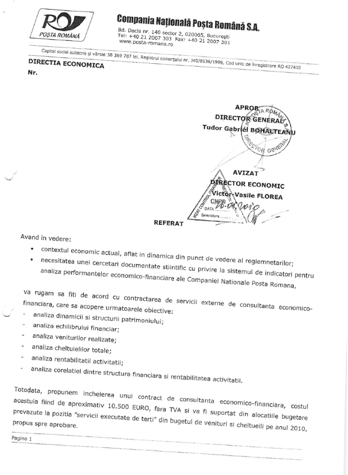 Așadar, în 20 ianuarie 2010, șefa departamentului ,,analize economice” din Poșta Română se trezește brusc dimineața și își definește nevoia (imediat aprobată de Tudor Bohâlțeanu) de ,,cercetare documentată științific” privind ,,Sistemul de indicatori pentru analiza performanțelor economico-financiare ale Companiei Naționale Poșta Română”. Mai sus, vedeți nota de fundamentare și inexplicabila evaluare a unui contract de consultanță de ,,aproximativ 10.500 de Euro fără TVA” pentru asta.