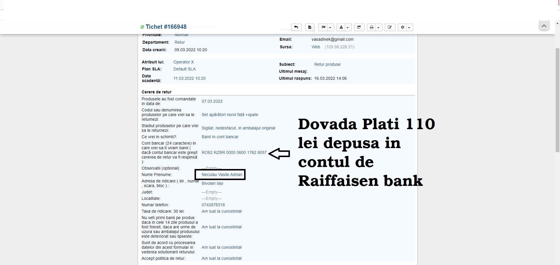 Pentru un produs de 110 lei denigrezi o firma o persoana care s-a dovedit ca nu a fost inselat cu absolut nimic , persoana respectiva primindu-si bani in termenul legal.