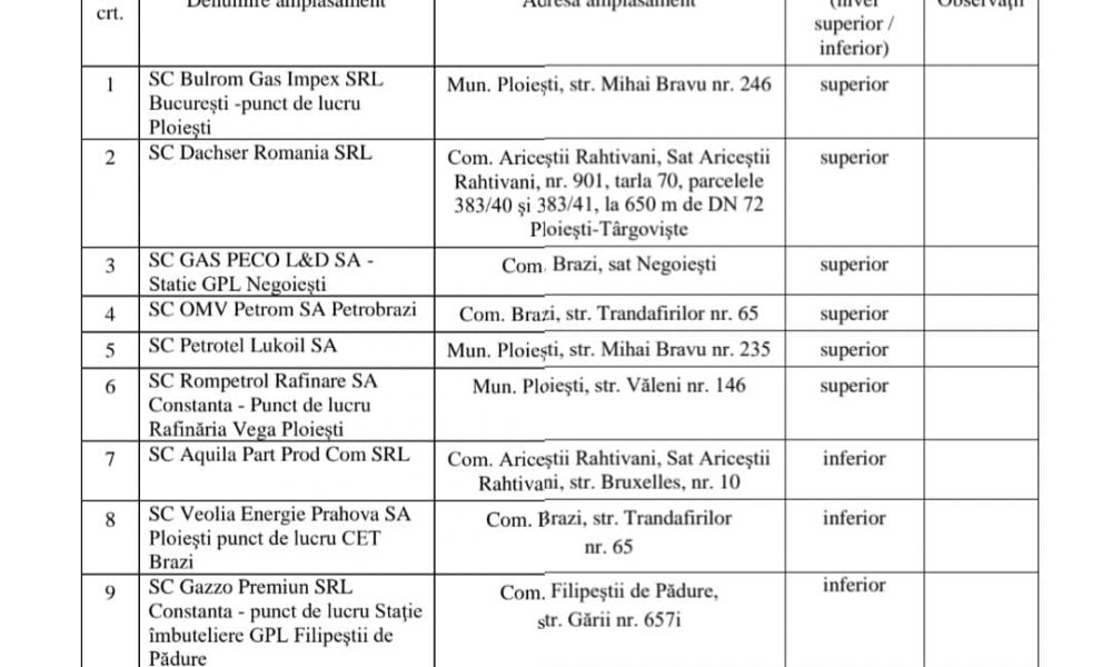 Mai mult, jos aveti si lista amplasamentelor de tip Sveso din judetul Prahova aflate in inventar la data de 31.12.2021: