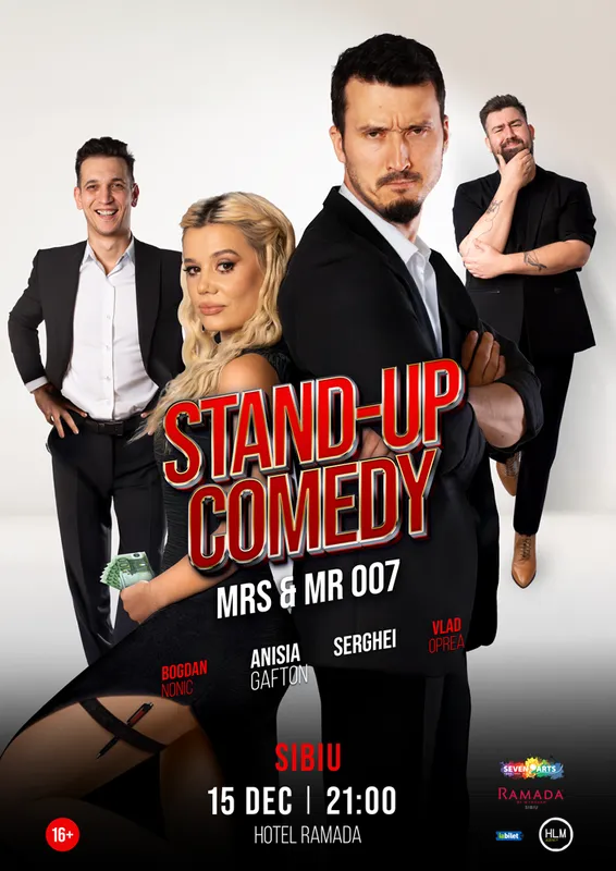 Publicul din Sibiu este invitat să ia parte la o „misiune de comedie explozivă” la Hotel Ramada Sibiu. Evenimentul de stand-up comedy „Mrs & Mr 007” îi aduce pe scenă pe Anisia Gafton și Serghei, alături de Bogdan Nonic și Vlad Oprea.