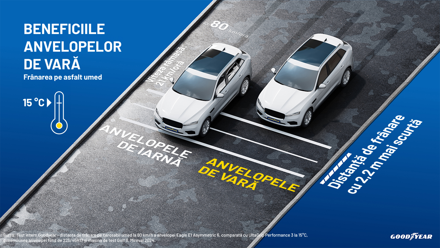 București, 28 martie 2024 – Temperaturile au început în sfârșit să crească, așa că Goodyear recomandă șoferilor să treacă la echipamentul de vară. Alegerea anvelopelor potrivite afectează extrem de mult distanțele de frânare, care pot fi de până la 15 metri pe un drum umed la 80 km/h și de 7 metri pe un drum uscat la 100 km/h. Totodată, teste recente au arătat că la frânarea pe un drum umed, în temperaturi de 15 °C și la 80 km/h, anvelopele de iarnă au o distanță de frânare cu aproximativ doi metri mai mare decât cele de vară. 2