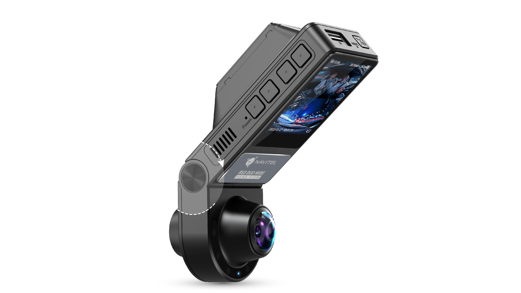 Noul NAVITEL RS3 DUO WIDE este un DVR care se remarcă prin designul său ergonomic, economisind spațiu și asigurând o vizibilitate optimă pentru șofer. Dispozitivul este compus din două părți, una dintre acestea fiind complet atașabilă pe parbriz, fără a necesita un suport suplimentar. Cele două camere integrate pot fi înclinate cu până la 70°, oferind astfel flexibilitate în montaj, indiferent de tipul de vehicul – de la mașini de teren cu parbriz abrupt, până la mașini sport.