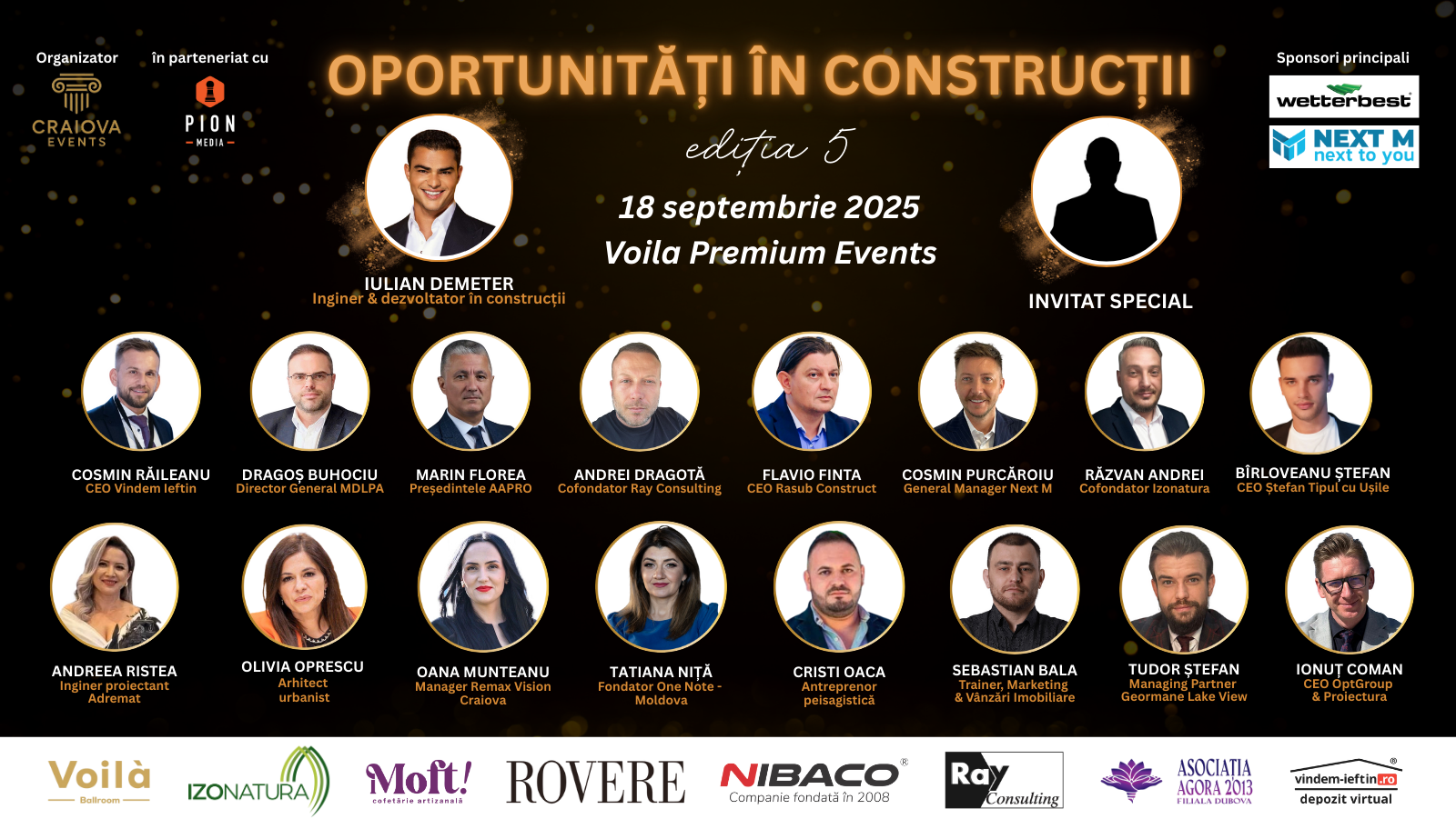 “Oportunități în Construcții” s-a născut din dorința de a aduce într-un singur loc factorii relevanți din piață, pentru a facilita dialogul între profesioniști și clienți. Evenimentul nu este doar o conferință, ci o adevărată platformă de networking, know-how și experiențe interactive. Am stat de vorbă cu Dana Enache, fondator Craiova Events, și cu Răzvan Jianu, Creator de Visuri la Pion Media, pentru a afla obiectivele și surprizele acestei ediții. Care este scopul principal al acestei ediții și ce obiective v-ați propus pentru participanți?„Scopul acestei ediții, ca și al celor precedente, este să aducem în jurul clientului, consumator final, care intenționează să achiziționeze sau să construiască un imobil, toți factorii importanți care îl pot ajuta să ia cea mai bună decizie de cumpărare. Pentru ediția a V-a ne propunem să transmitem participanților informații valoroase din sectorul construcțiilor, utile atât celor din industrie, cât și clienților finali. Avem mulți invitați din zona imobiliară, ceea ce ne oferă ocazia de a crea o punte solidă între cerere și ofertă.” – Dana Enache, fondator Craiova Events Ce noutăți sau surprize pregătiți pentru această ediție?„Anul acesta aducem un upgrade semnificativ pe partea de comunicare. Vom avea peste 10 ecrane digitale în sală, dedicate promovării sponsorilor și partenerilor. Consider că oricine contribuie la realizarea unui eveniment de asemenea amploare merită vizibilitate și susținere. În plus, am primit deja mai multe confirmări din partea sponsorilor, care au anunțat că vor veni cu standuri atractive, unde vizitatorii vor putea descoperi informații utile despre diverse materiale și soluții, le vor putea „testa” și experimenta în mod direct.” – Răzvan Jianu, Creator de Visuri la Pion MediaSpeakeri de top – know-how direct de la sursă