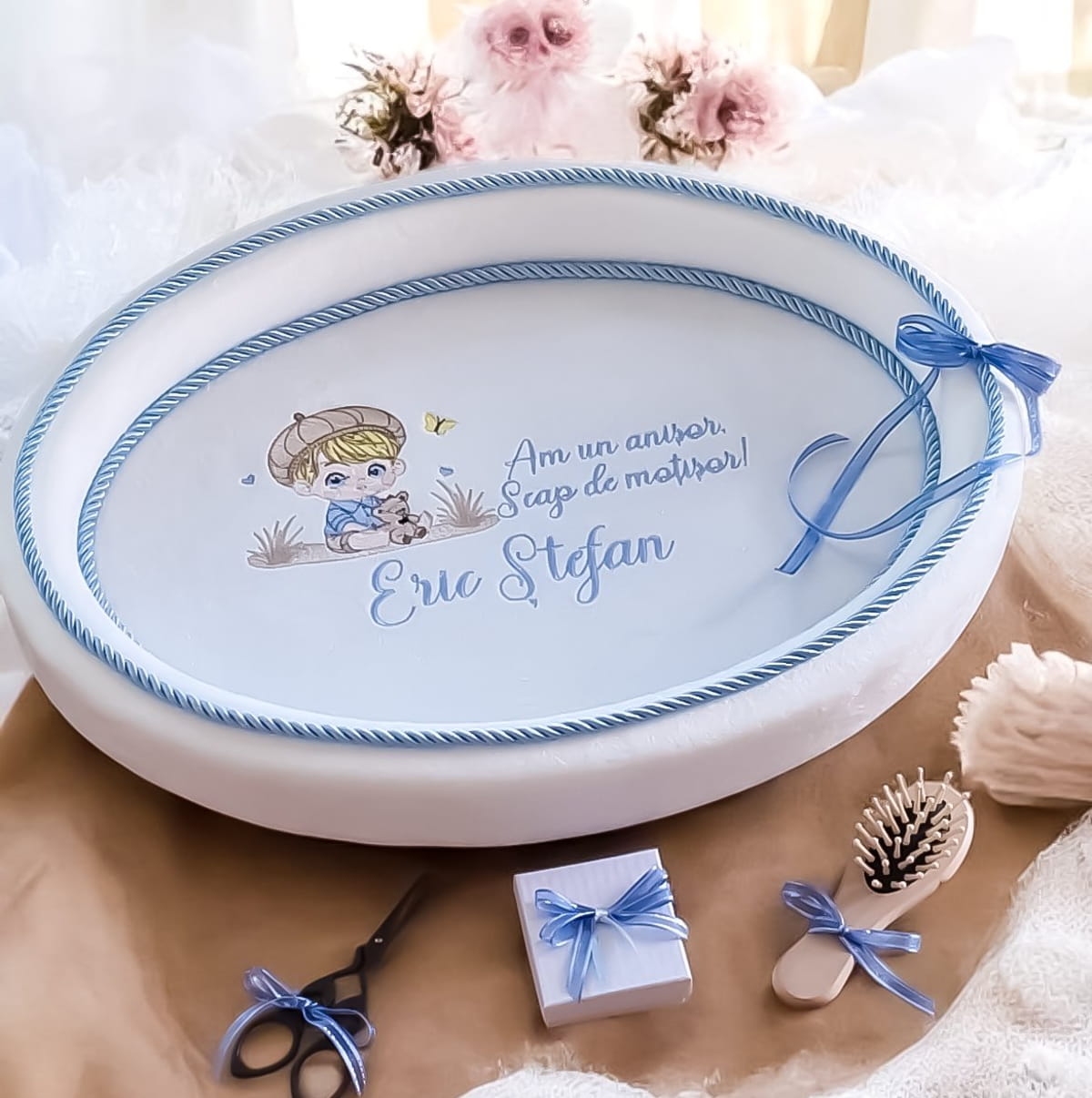 3. Caseta pentru prima șuviță. Șuvița tăiată de nașă este un simbol al acestui moment și merită păstrată cu grijă. O casetă delicată, personalizată cu numele și data, transformă această amintire într-un mic tezaur de familie.
